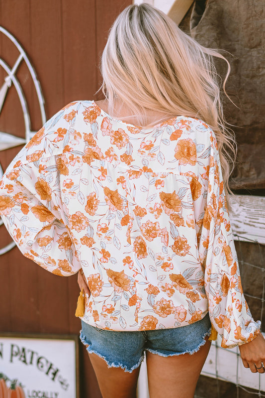 White Tassel Tie V Neck Bubble Sleeve Floral Blouse
